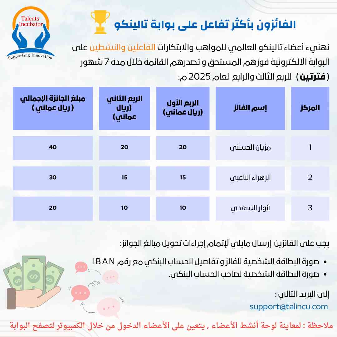 الشركات الطلابية الحاصلة على تكريم مالي من تالينكو العالمي للمواهب والإبتكارات خلال مشاركتها في المهرجان العلمي الزراعي الرابع عشر ( مداد ) بجامعة السلطان قابوس