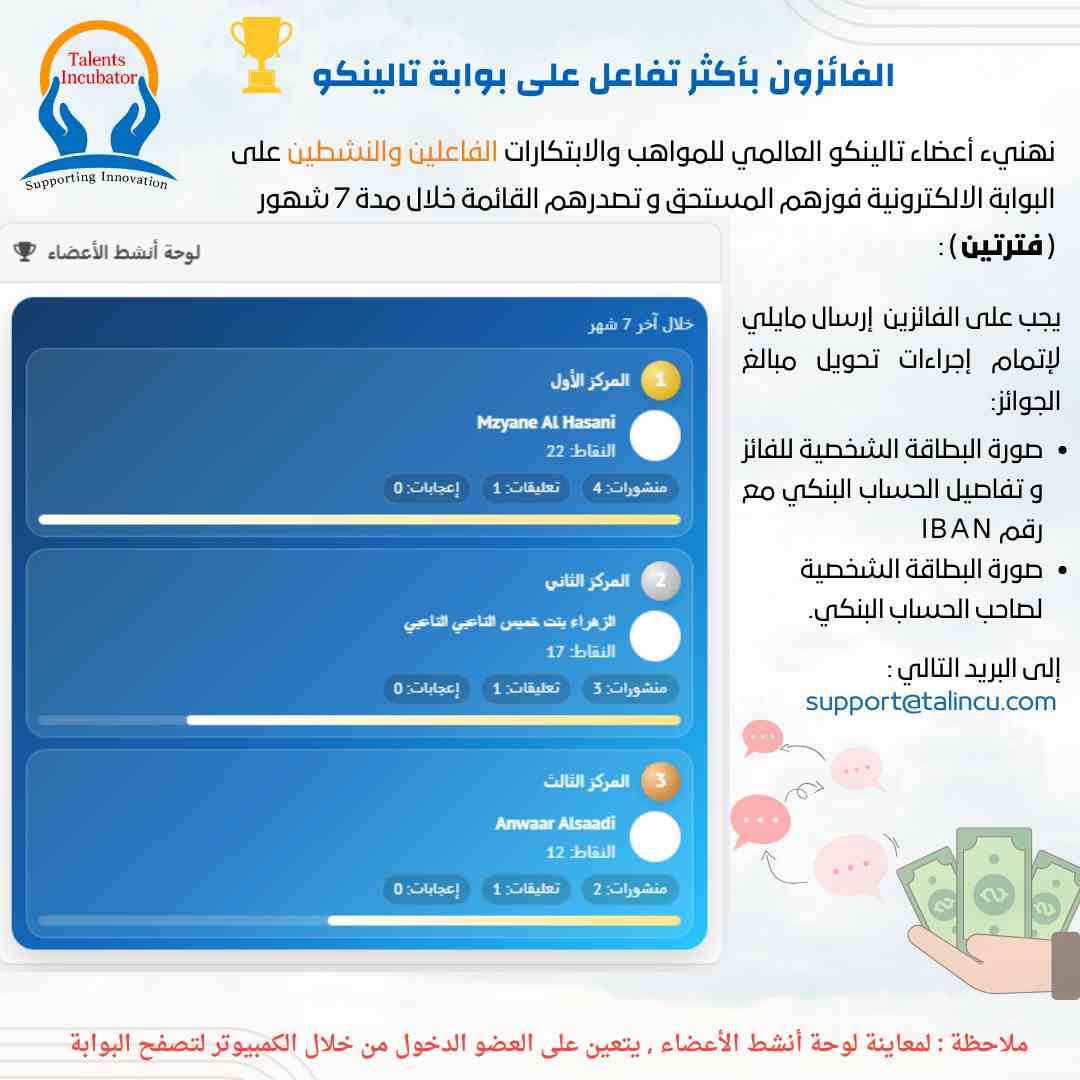 تابعوا لوحة أنشط الأعضاء لمعرفة الفائزين مع بداية العام (اللوحة تظهر بالقائمة اليمنى على الكمبيوتر وليس الهاتف )